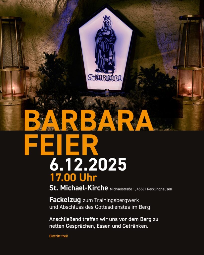Auch in diesem Jahr lädt das Trainingsbergwerk herzlich zur traditionellen Barbarafeier ein. Die Veranstaltung beginnt am 6. Dezember um 17 Uhr mit einer feierlichen Messe in der St. Michael-Kirche (Michaelstraße 1, 45661 Recklinghausen).