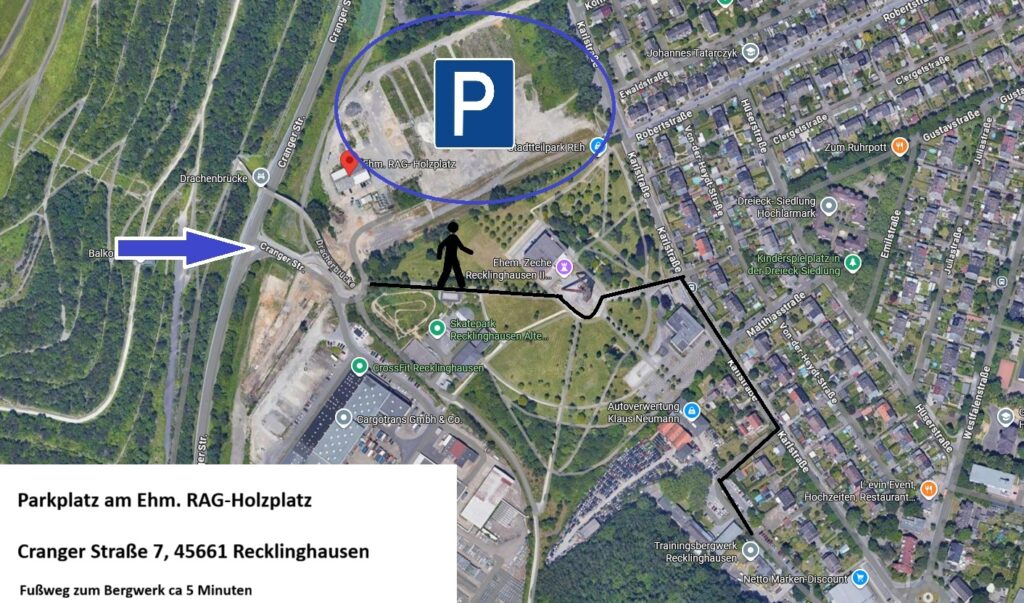 Parkmöglichkeiten gibt es am ehemaligen Holzplatz der RAG.